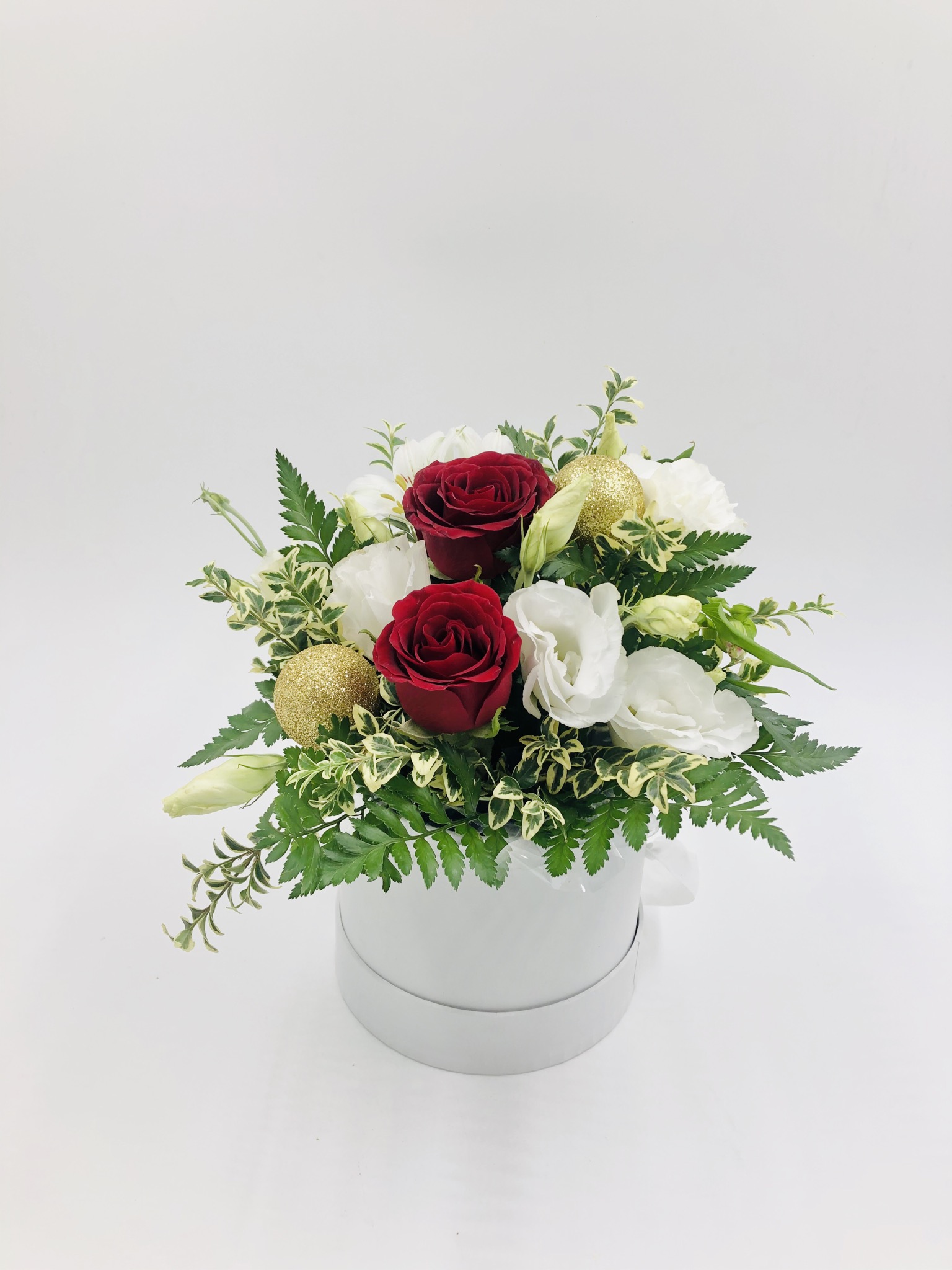 A beautiful gift for the one you love. Modern arrangement of red roses white lisianthus complimented with fine greenery foliage in a white round hat box